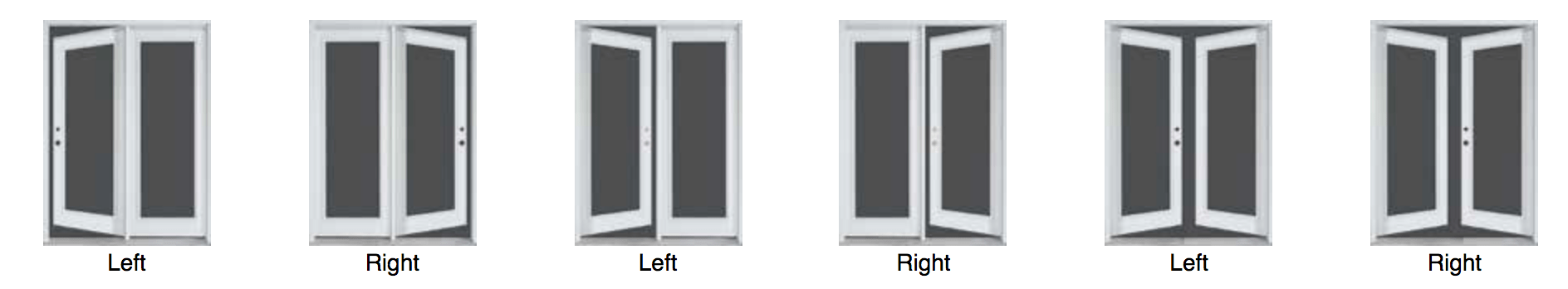 One door is fixed and the other opens inwards as viewed from the exterior. The door that opens is hinged at the centre. For ordering purposes, customers need to specify their preferences for the 1. Left or 2. Right opening door as seen in the sketches below.