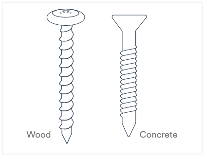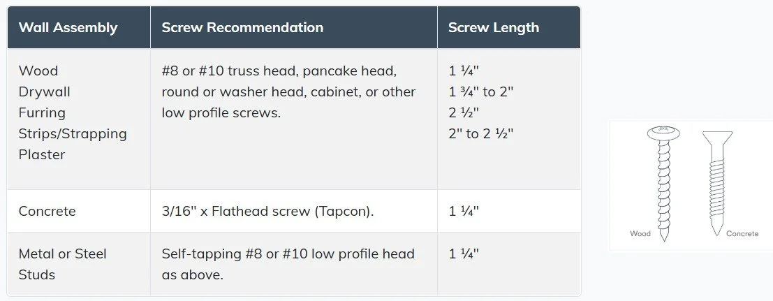Trusscore trims can be installed with any readily available wood (corrosion-resistant) screws with a minimum head diameter of 3/8", but we recommend different types of screws for different wall assemblies.